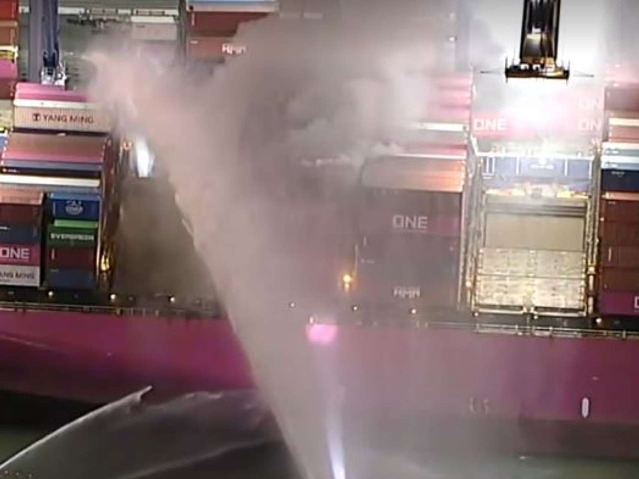 All crew members have been evacuated from a burning ship at San Pedro port after a fire caused an explosion that disrupted power and crane operations, the Los Angeles Fire Department said.