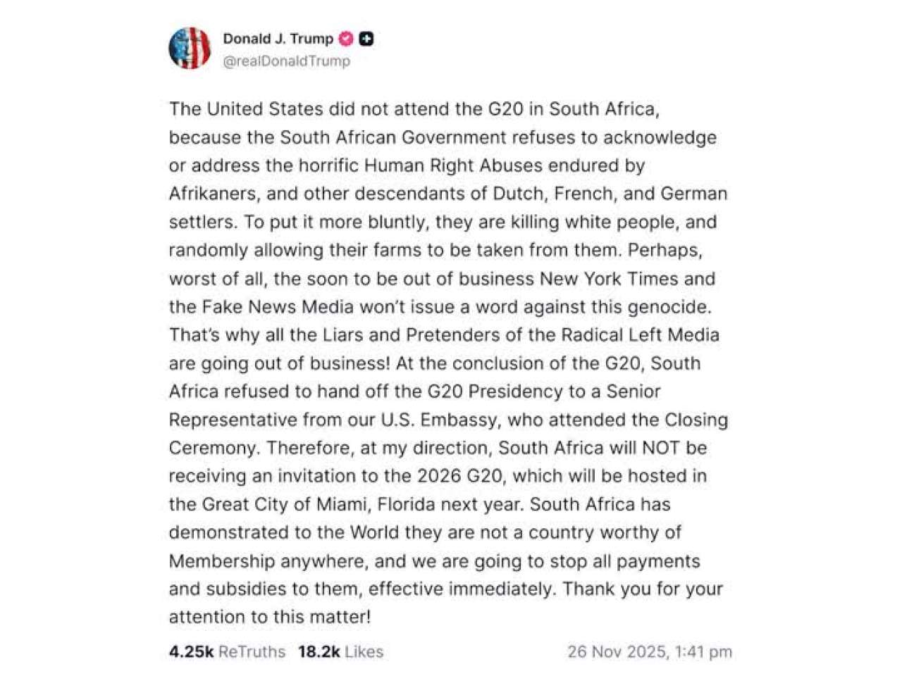 US President Donald Trump announced on Wednesday that South Africa would not be invited to next year's G20 summit in Miami, taking his diplomatic offensive against the country to a new level.
